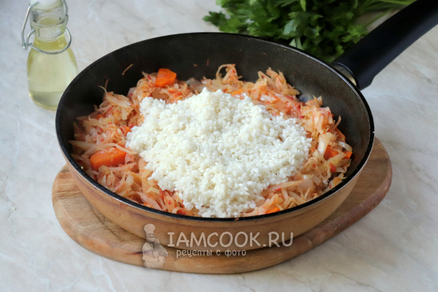 После чего засыпать в сковороду рис, предварительно промыв его.