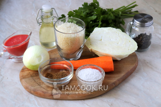 Подготовить все необходимые ингредиенты для классического лаханоризо по-гречески. Овощи очистить и вместе с зеленью промыть под холодной проточной водой.