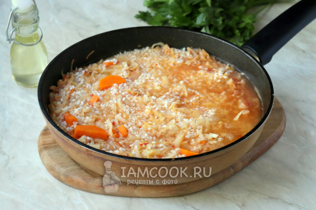 Содержимое сковороды залить чистой фильтрованной водой, аккуратно перемешать и довести до кипения. После чего снизить огонь до минимального, накрыть сковороду крышкой и томить 30 минут.