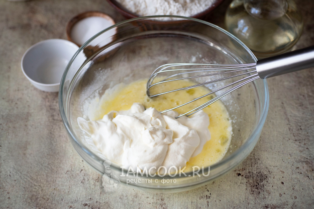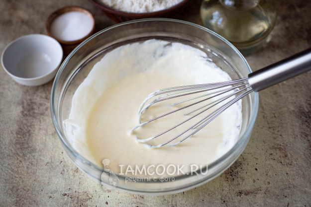 В миску вбить яйцо, добавить разрыхлитель, соль и сахар. Перемешать.