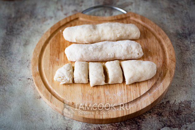 Поделить всю массу на небольшие части, из которых скатать колбаски, порезать каждую на равные кусочки.