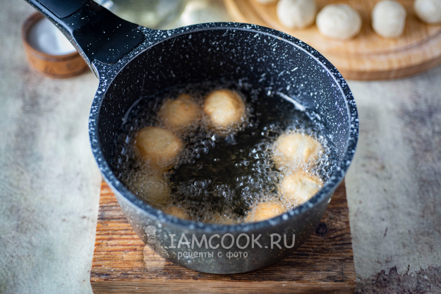 В сотейник залить такое количество растительного масла, чтобы заготовки будущих баурсаков полностью были покрыты. Разогреть на среднем огне сотейник с маслом и аккуратно опустить в горячее масло партию заготовок баурсаков. В процессе регулярно помешивать баурсаки ложкой для равномерного обжаривания.