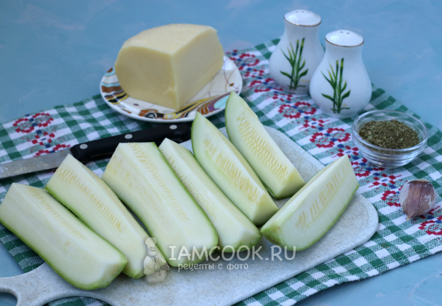 Для запекания кабачков с сулугуни в духовке подготовить из списка необходимые ингредиенты.