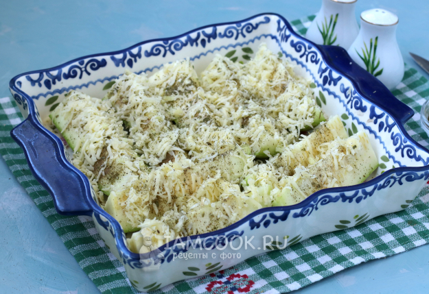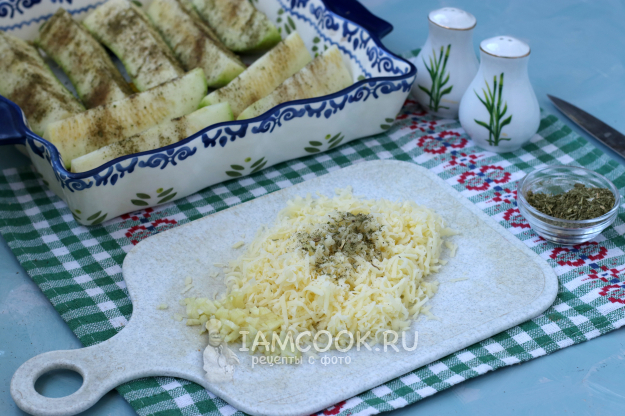 Посыпать кабачки сверху сыром и чесноком. Немного сыра можно оставить для посыпки готового блюда, но это по желанию. Основной сыр запечётся, а тот, которым вы посыплете после запекания, просто расплавится на горячих кабачках и сделает внешний вид закуски более интересным.
