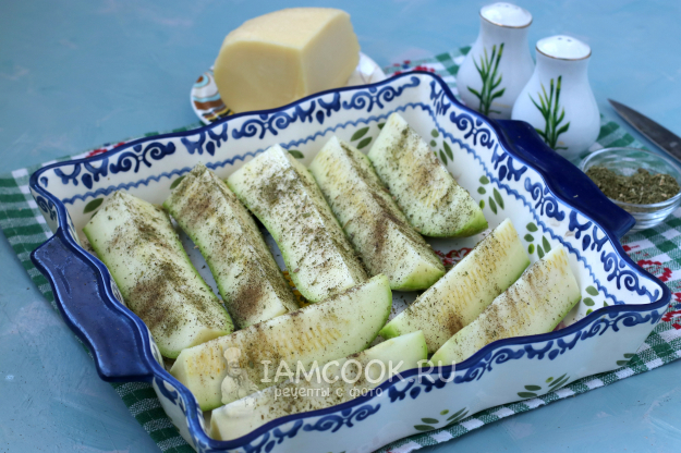 Кабачок хорошо вымыть, обрезать краешки. Разрезать его вдоль на 4 части. Если кабачок длинный, то можно его предварительно разрезать пополам, а затем каждую часть - ещё на четыре ломтика. Чистить кабачок не нужно.