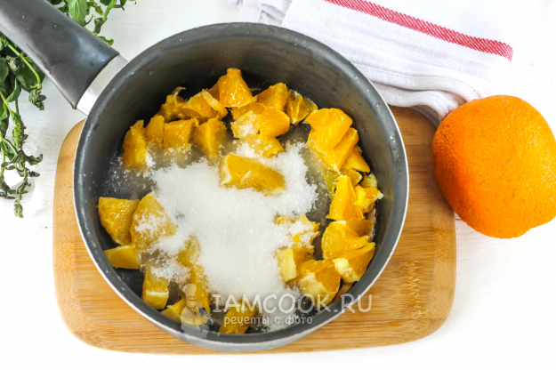 В это время очистите плод от кожуры и белого слоя, разделите на дольки. Удалите косточки и нарежьте дольки небольшими кусочками. Высыпьте нарезку в емкость и добавьте сахарный песок. Прогрейте примерно 8-10 минут, практически до карамелизации, на умеренном нагреве.