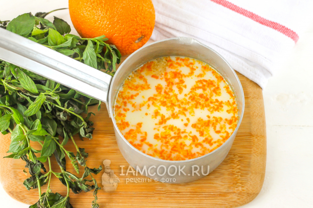 В это время ошпарьте апельсин кипятком и натрите цедру. Добавьте апельсиновую цедру в емкость к сливкам и доведите содержимое емкости до температуры в 70-80 градусов. Выключите нагрев и тщательно вмешайте желатин в жидкость, чтобы и он, и сахар полностью растворились. Остудите примерно 20 минут. Если не любите ощущать цедру в десертах, то на этом шаге процедите жидкость через ситечко с мелкими ячейками.