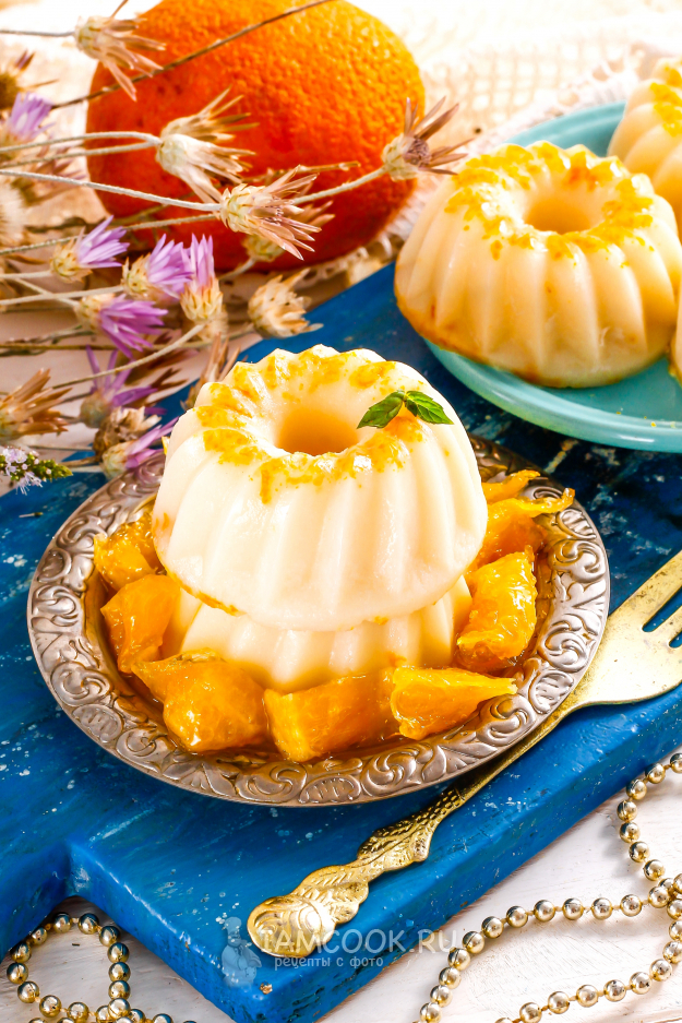 Застывшую апельсиновую панна-котту выложите на блюдце или тарелку, украсьте томленой мякотью и подайте десерт к столу.