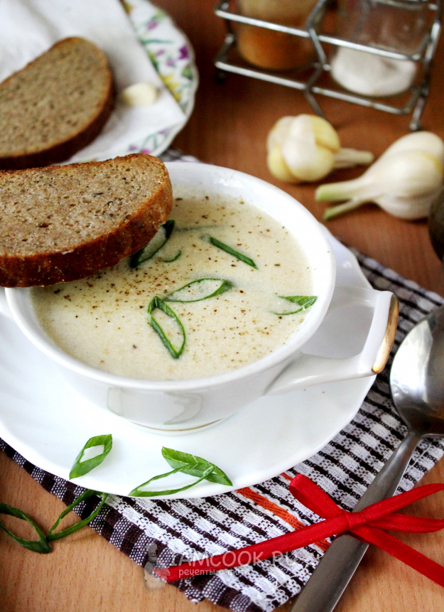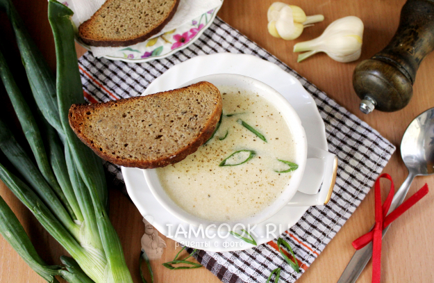 Подавайте сливочный суп по-французски с зеленью и чесночными гренками.