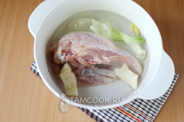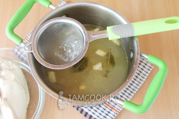 Отварите куриную грудку на кости, добавив для ароматизации бульона обрезки лука и кореньев, стебли зелени. Сварите при очень медленном кипении куриный бульон.
