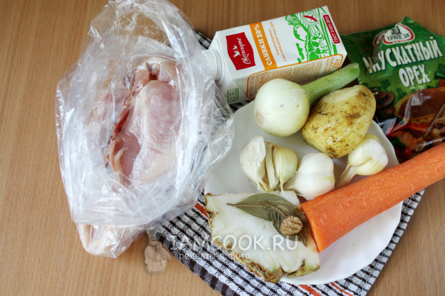Возьмите продукты для приготовления сливочного супа с чесночными гренками по-французски.