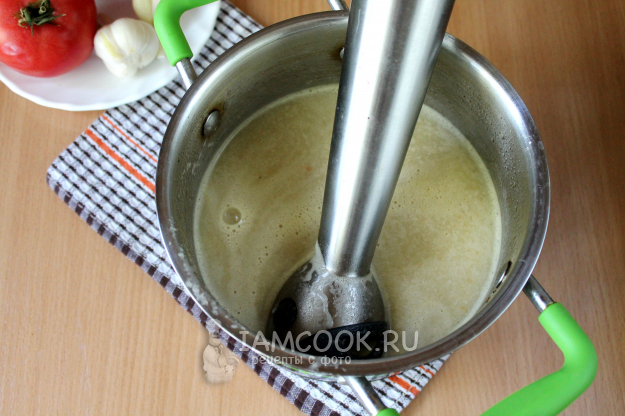 Выньте лаврушку. Пюрируйте овощи погружным блендером. Куриное мясо можно подать отдельно или тоже пробить блендером в общую массу, можно совсем его не добавлять в суп.