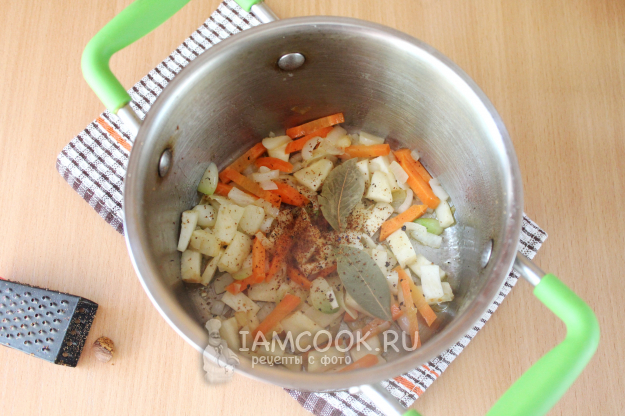 Для аромата и завершенности вкусовой композиции в суп добавляется тертый мускатный орех. Натрите в кастрюлю к овощам мускатный орех. Добавьте пару лавровых листочков.