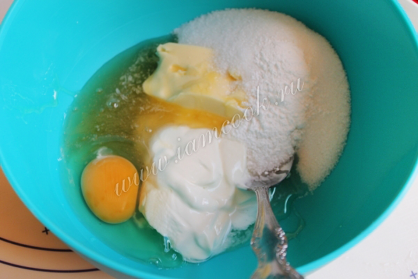 Итак, для теста смешаем мягкое масло, сметану, сахар, мед , яйцо.