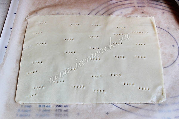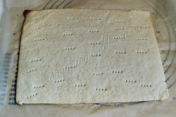 При помощи обычного ножа срежем лишние края, так чтобы получился прямоугольник, примерно 20 на 27 сантиметров. Сделаем наколы вилкой.