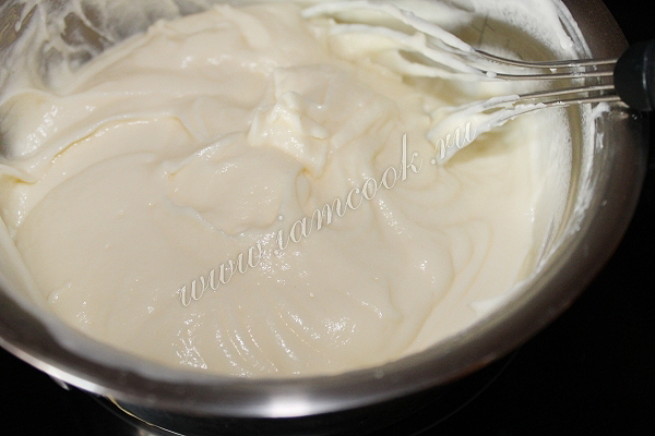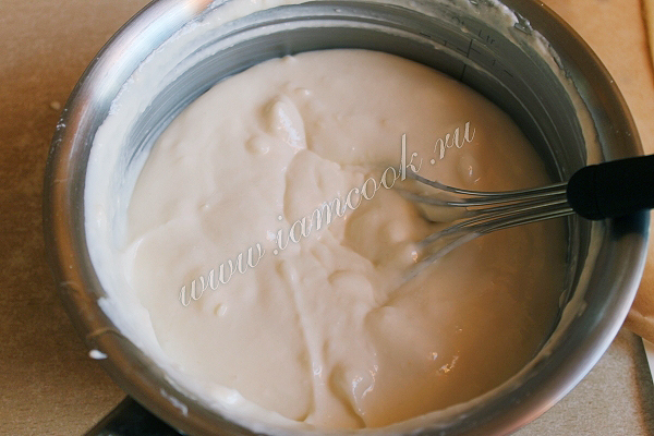 Поставим эту массу на водяную баню и помешивая варим до загустения. У меня на этот процесс ушло где-то 5 минут. Как только масса начинает густеть, сразу убираем крем с воды.