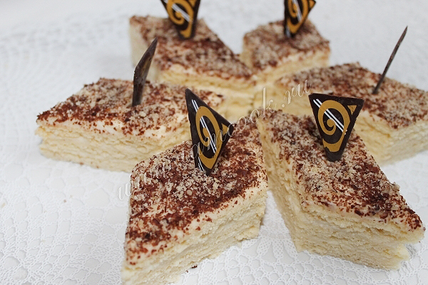 Получившийся торт посыпаем сверху тертым шоколадом и ровно разрежем на ромбики. Вот таким образом, как на фото. Пирожные можно можно пробовать!