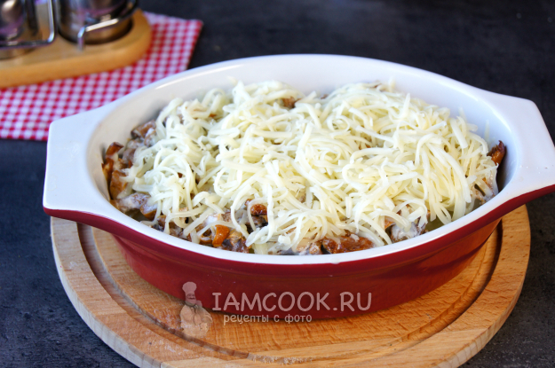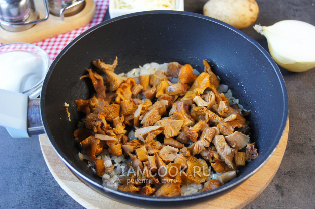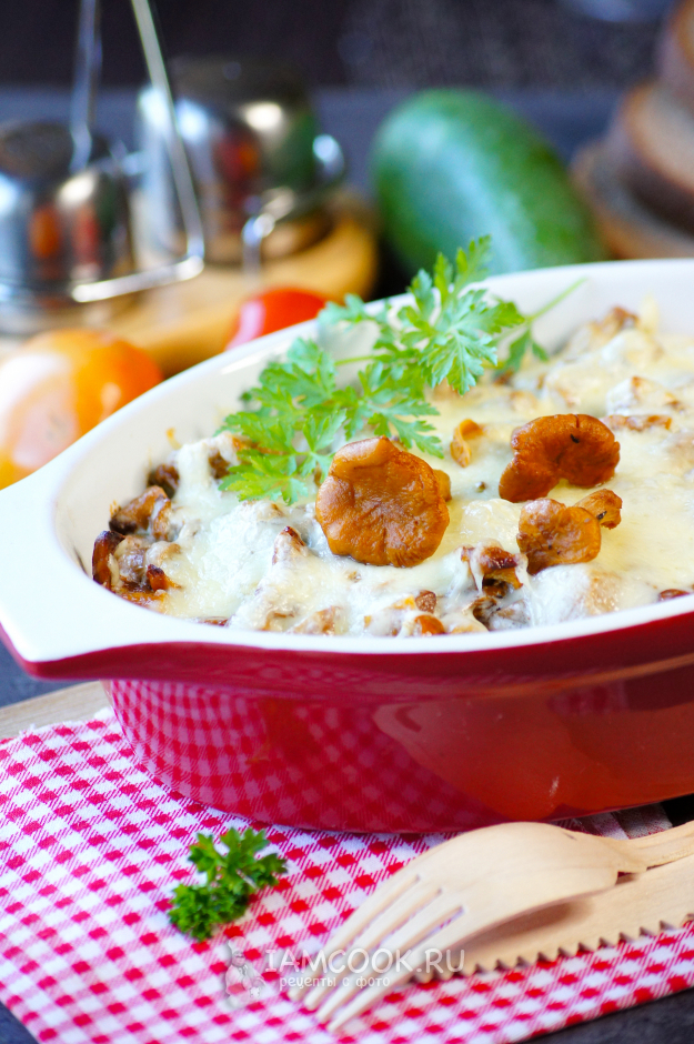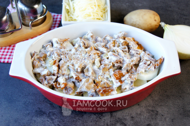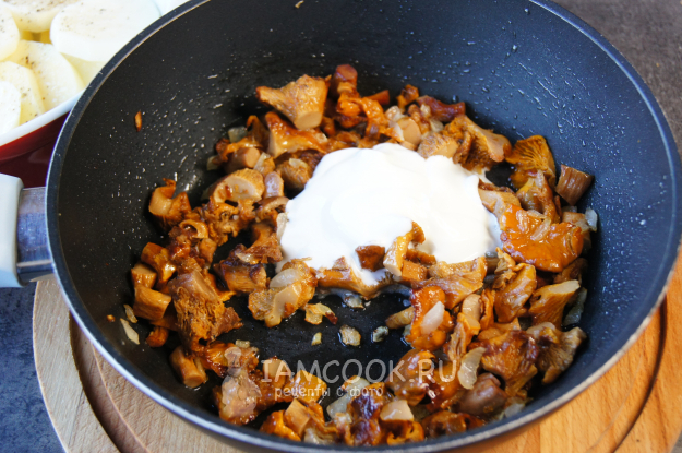 Сверху выложите обжаренные лисички в сметане, накройте фольгой и поставьте в разогретый до 190 градусов духовой шкаф на 40 минут.