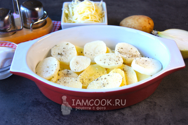 Картофель очистите, промойте и нарежьте на кружочки. Форму смажьте сливочным маслом, выложите картофель на дно формы, посолите и поперчите по вкусу, можно приправить любимыми специями, но не переборщите - важно, чтобы они не перебили аромат лисичек.