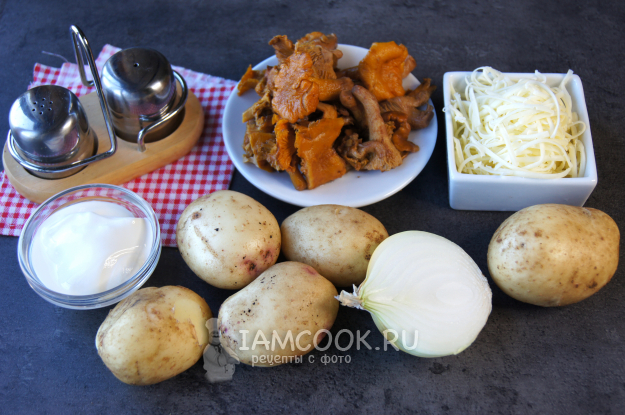 Подготовьте все необходимые продукты для приготовления картофельной запеканки с лисичками в духовке. Очистите лисички от загрязнений, промойте в холодной воде.