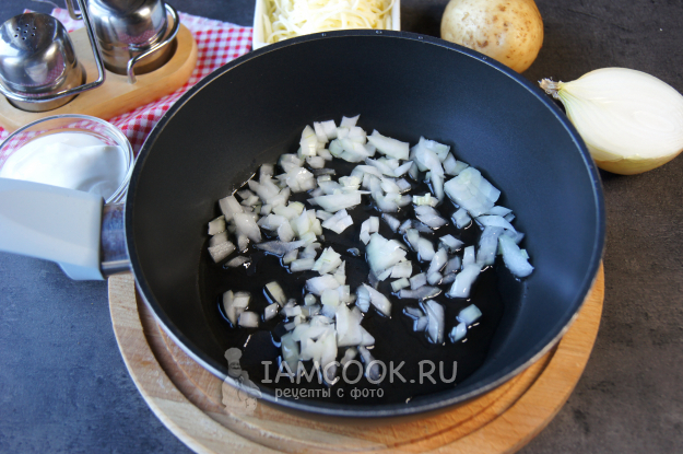 Лук очистите, мелко нарежьте, выложите в разогретую сковороду с растительным маслом и обжарьте до прозрачности, помешивая, на среднем огне.