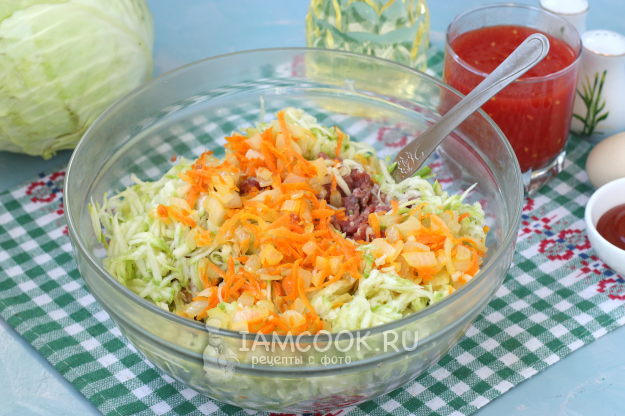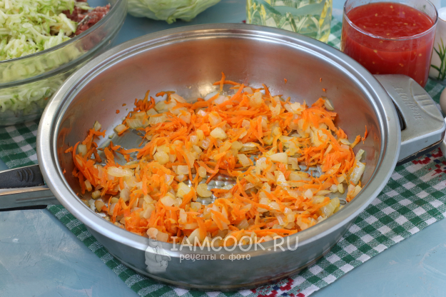 Отобрать половину зажарки и добавить её в фарш, тщательно перемешать.