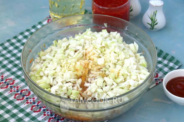 Небольшими кубиками нарезать капусту, соединить её с фаршем и добавить яйцо. На этом же этапе добавить нужное количество соли и перца, а также можно добавлять любые приправы по своему вкусу.