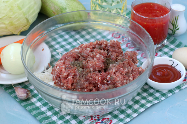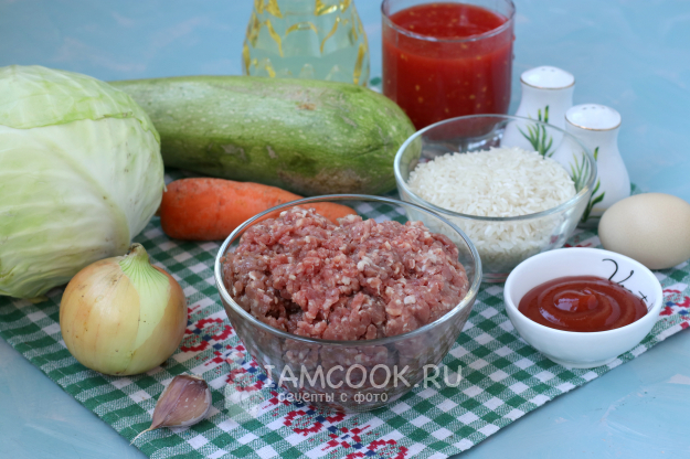 Для приготовления ленивых голубцов с кабачком и фаршем подготовить из списка необходимые ингредиенты.