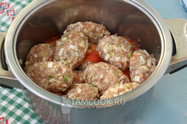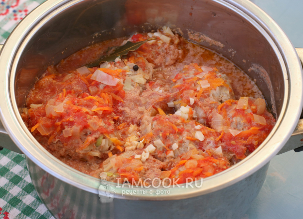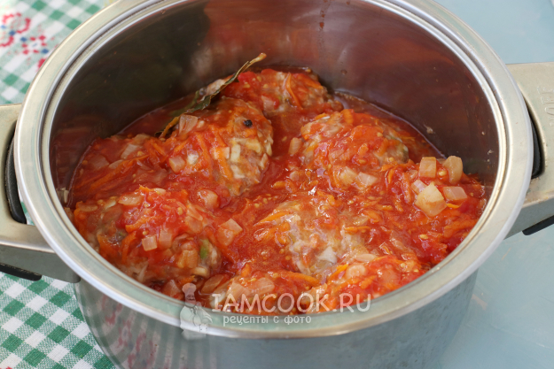 На дно кастрюли с толстым дном налить немного томатного соуса, так, чтоб он покрыл дно. Затем слоями выкладывать котлеты, каждую поливая соусом.