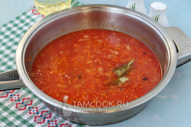 К оставшейся в сковороде зажарке добавить сначала томатный соус, немного перемешать и готовить 5 минут, затем влить томатный сок, добавить перец горошком и лавровый лист. Дать покипеть всему вместе 3-5 минут.