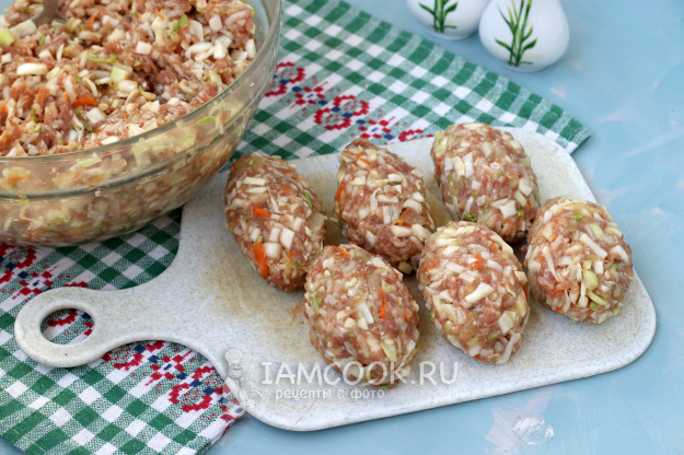 Тщательно перемешать фарш и сформировать из него котлетки - будущие ленивые голубцы.