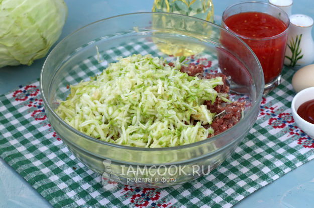 Натереть на тёрке кабачок и добавить его к фаршу. Молодой кабачок я натираю вместе со шкуркой.