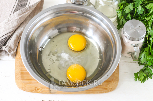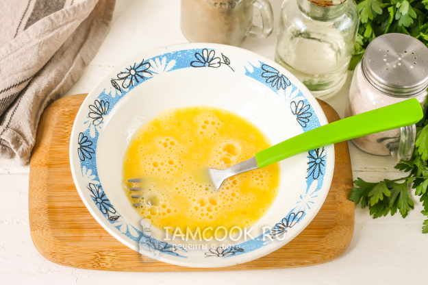 Два куриных яйца вбейте в глубокую емкость, всыпьте соль и влейте воду. Бендерики с мясом чем-то похожи на крымские чебуреки - начинка должна быть сырой и сочной, а тесто - хрустящим, поэтому оно создается на воде! Но вы можете заменить воду молоком, кефиром или другим молочным напитком, если привыкли выпекать блины по определенному рецепту. Взбейте всё содержимое емкости.