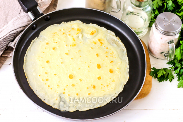 Спустя указанное время прогрейте сковороду и влейте на нее порцию теста, обжарьте по минуте с каждой стороны, выпекая тонкие блинчики.