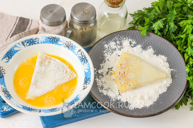 На другую тарелочку высыпьте оставшуюся муку. Заготовки обпанируйте сначала в муке, затем - во взбитом яйце.