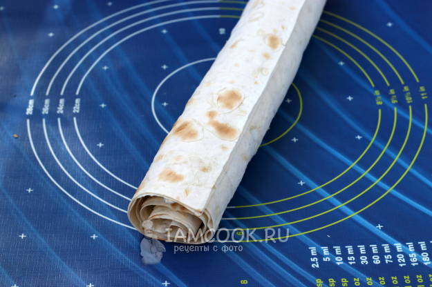 Свернуть рулет до конца. Если вы не предполагаете есть его сразу, то лучше завернуть в пищевую плёнку и убрать в холодильник.