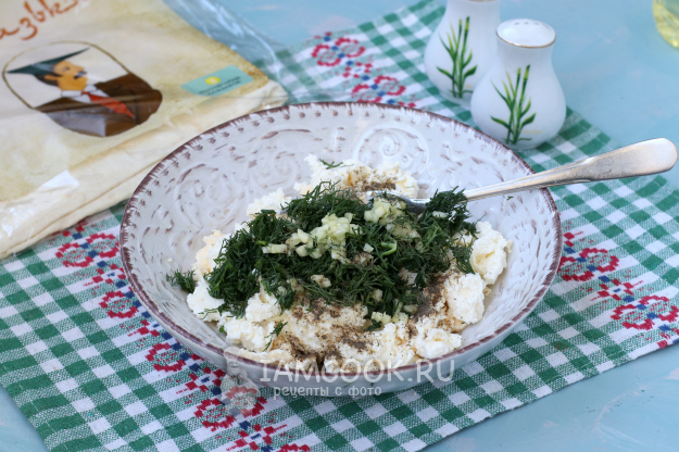 Для начинки я использовала 2 вида сыра, побоялась, что одной упаковки творожного не хватит и добавила один плавленый сырок. Можно использовать только творожный сыр. Плавленый сырок сразу размять вилкой, добавить к нему творожный сыр, измельчённые укроп и чеснок. Сыры, как правило, уже содержат соль, поэтому её можно не добавлять, а вот перцем приправить можно. В любом случае, попробуйте готовую начинку, и если соли вам не хватает, добавьте.