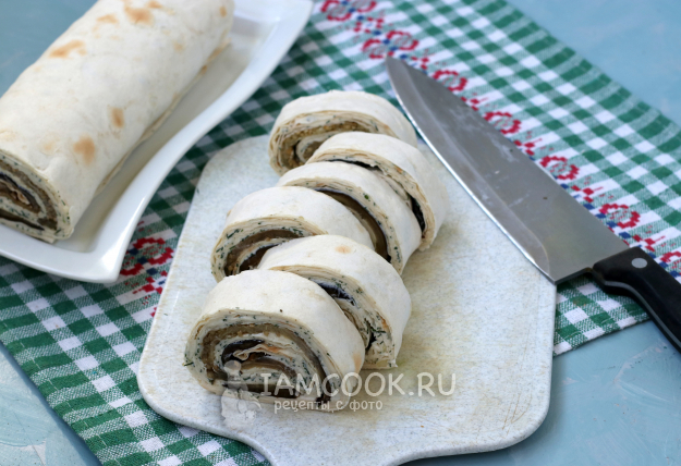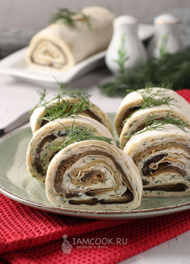Я резала рулет сразу. Как видите, рулет из лаваша с баклажанами прекрасно разрезается на небольшие порции, что очень удобно. Советую разрезать острым ножом, чтобы всё выглядело аккуратно.