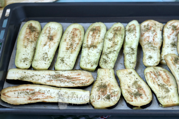 Сворачивать нужно начиная от края, на котором расположены баклажаны. Два слайса у меня в длину не поместились, поэтому я их положила поперёк, чтобы все баклажаны заканчивались на одном уровне.