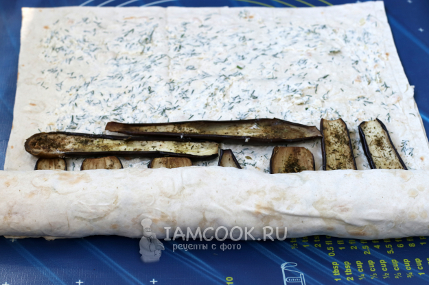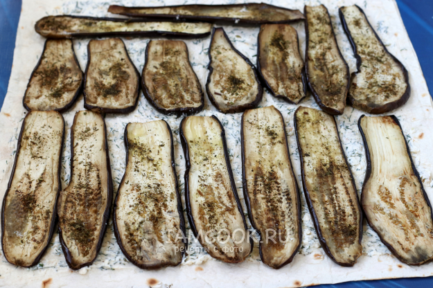 Мне нравится сворачивать лаваш в 2 слоя, так он не порвётся и его можно без проблем нарезать на много порционных кусочков. На подложке разложить лист лаваша, смазать его половиной сырной массы и сверху положить второй лист. Его также смазать оставшейся сырной массой. Разложить поверх сыра баклажановые слайсы. Они займут где-то 2/3 длины всего лаваша. Удобней раскладывать слайсы в длину.