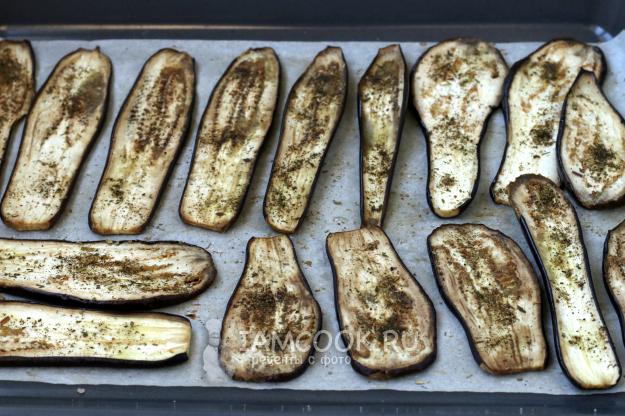 Поставить баклажаны запекаться в разогретую до 200 градусов духовку на 15-20 минут. Затем дать баклажанам остыть.