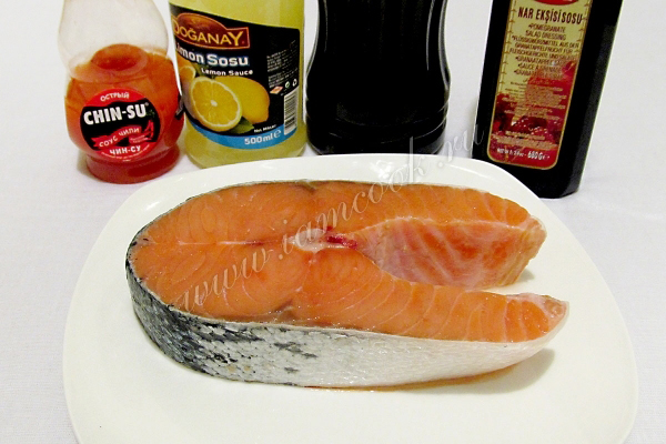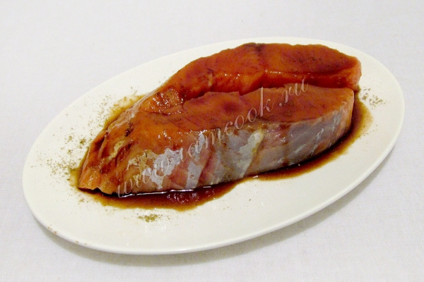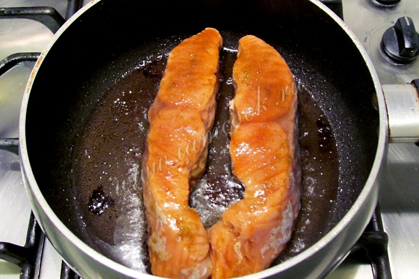 Предлагаю приготовить пикантную семгу в маринаде. Так как рыба эта жирная, то для ее обжарки достаточно 1 ст.л. масла. Гарнир приготовьте по своему вкусу, отлично подойдут рис, картофель или тушеные овощи.
