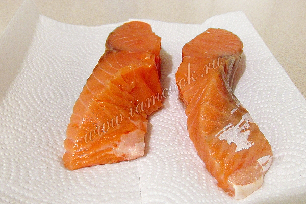 Рыбу вымыть, очистить от кожи и костей, разделив на 2 куска. Промокнуть салфеткой от лишней жидкости.