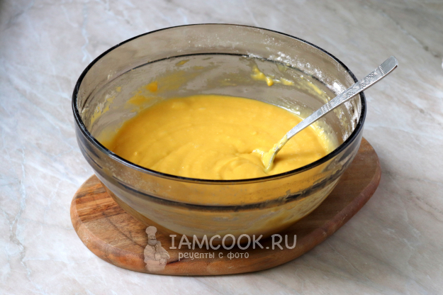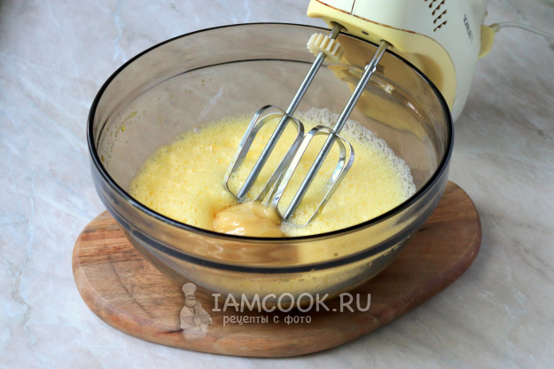 С помощью миксера взбейте массу до однородного состояния. Масса должна посветлеть и немного увеличиться в объеме.