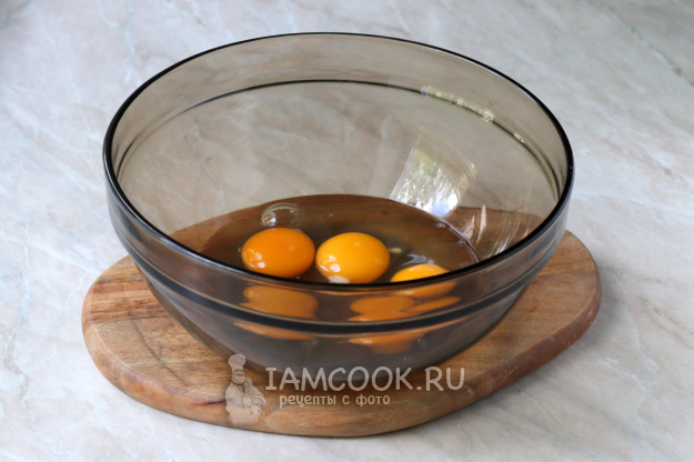 В чистую сухую миску вбейте куриные яйца и добавьте ванильный сахар. Также, для лучшего взбивания, можно добавить щепотку соли или пару капель лимонного сока.