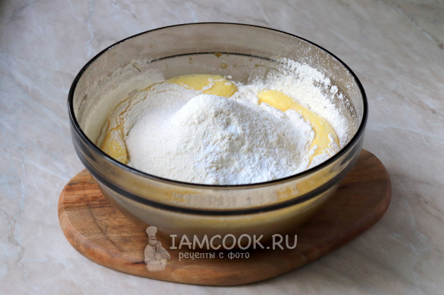 Введите просеянную пшеничную муку и разрыхлитель.