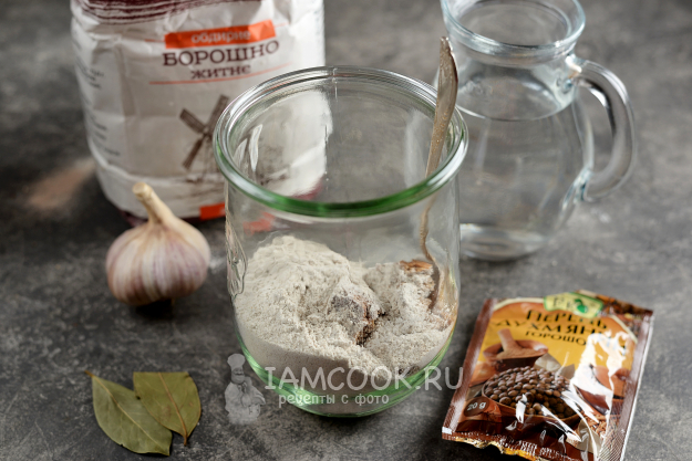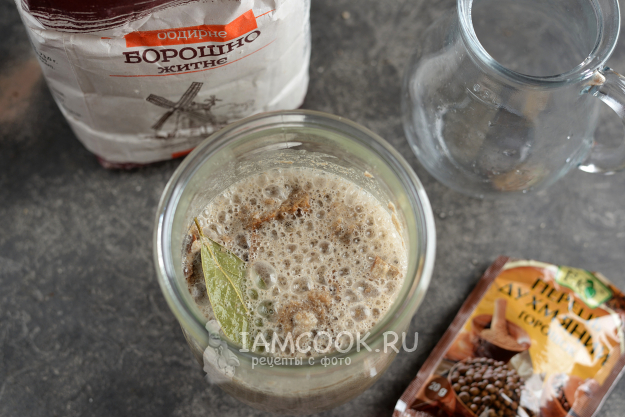 В литровую банку положите поломанный на кусочки ломоть ржаного хлеба, всыпьте ржаную муку.