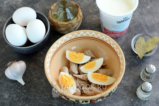 Очищенные от оболочки белые колбаски нарежьте кусочками, выложите в глубокую тарелку, добавьте вареное яйцо. Обычно его разрезают пополам или на четвертинки.