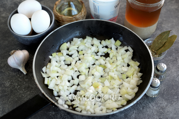 Пока колбаски закипают, влейте немного постного масла в сковороду, выложите нарезанный кубиком репчатый лук. Обжаривайте на тихом огне до прозрачности и мягкости.
