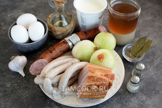 Подготовьте все продукты для приготовления польского супа Журек. Белые колбаски в суп идут обычно в виде сарделек, у нас я нашла их только в виде сосисок, но тоже очень приличного качества. Лук и чеснок почистите и помойте. Обязательно предварительно отварите яйца не дольше 10 минут, остудите в холодной воде, очистите от скорлупы. Копченую колбасу очистите от оболочки.
